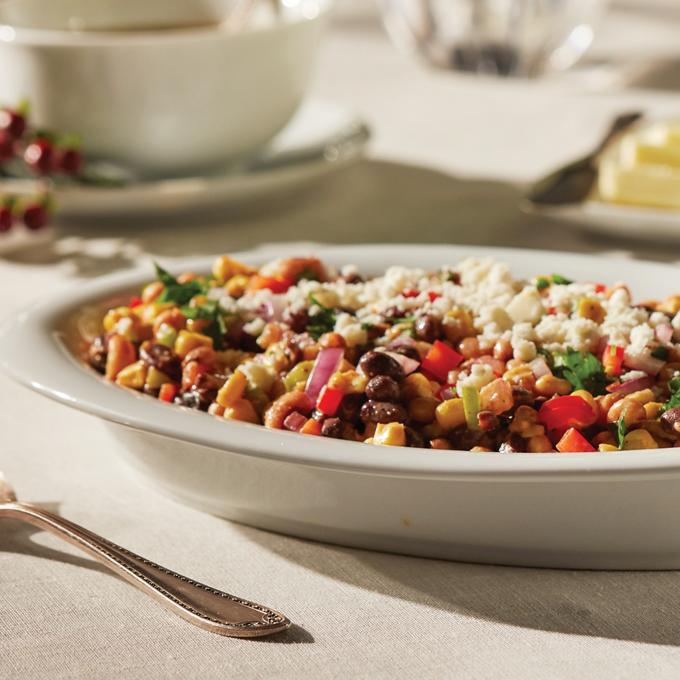- Place corn, black beans, and black-eyed peas in a medium bowl.
