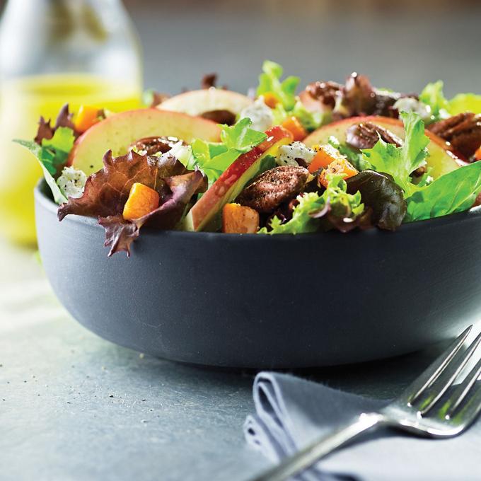 - Remove squash from oven and combine with apples, pecans, goat cheese and mix greens.