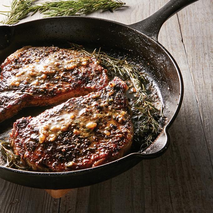 - Add rosemary sprigs to outside edge of pan. Cook steaks for 2 minutes then add butter to pan. Using a hot pad, tilt pan slightly to collect melted butter in a large spoon and baste steak while continuing to cook an additional 2 to 3 minutes, or to desired doneness.