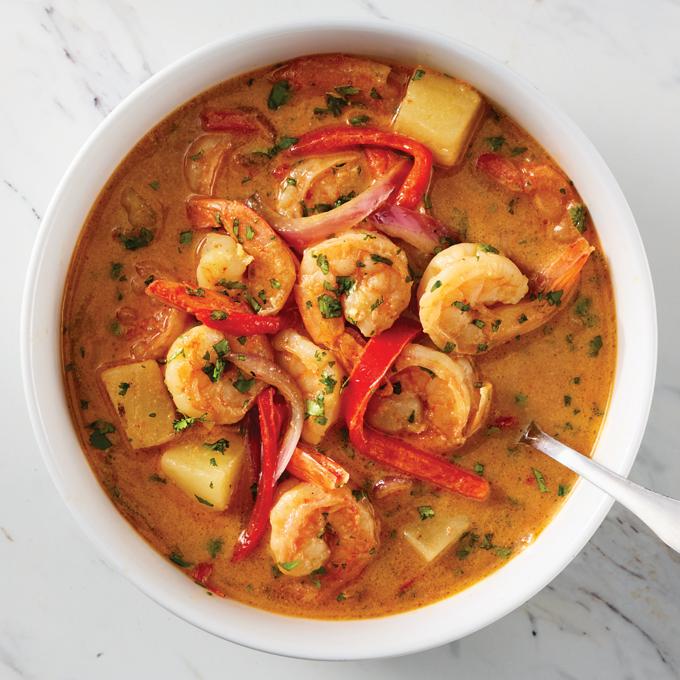 - Add shrimp and coconut milk, and stir gently. Cover and cook until potatoes are fork tender (about 5 to 6 minutes) and shrimp are cooked through. Sprinkle cilantro over top and serve.