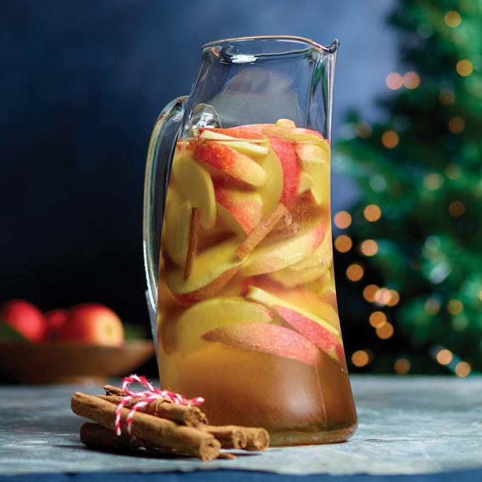 - In a large pitcher or jar, combine wine, bourbon, maple syrup, apples, ginger and cinnamon sticks. Cover and chill a minimum of one hour to allow flavors to develop.