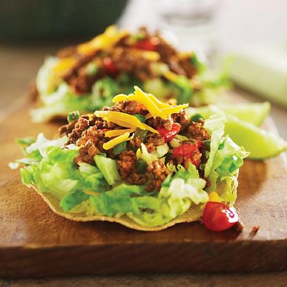 - To assemble, place 2 tostadas on a plate and top with 1/2 cup lettuce, 1/3 cup beef and 1/4 cup cheese.