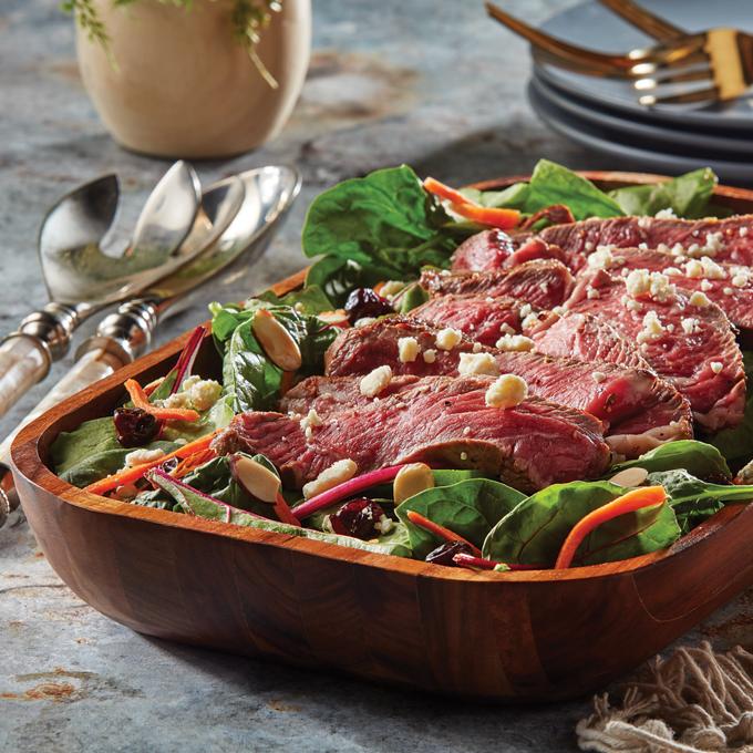 - Slice steak into thin, bite-sized pieces. Divide salad evenly between serving bowls or plates. Top with sliced steak.