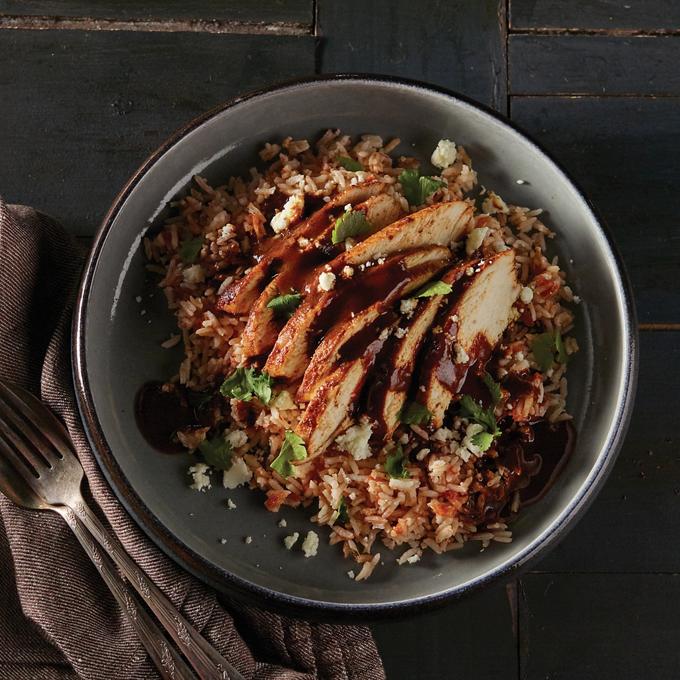 - To plate, slice chicken and serve over rice with a few spoonfuls of mole sauce and garnish with queso fresco and cilantro, if desired.