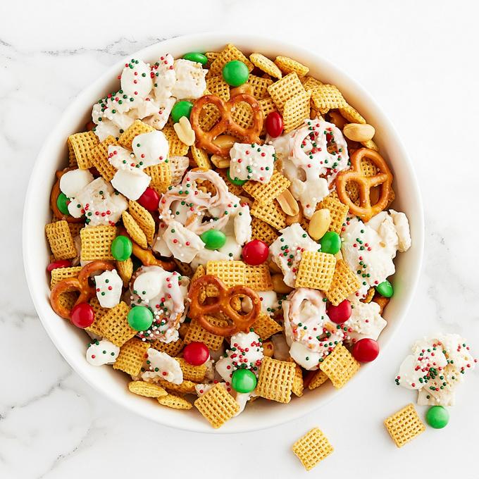 - Line 2 large, rimmed baking pans with wax paper. Add Chex Cereal to a large microwaveable bowl.