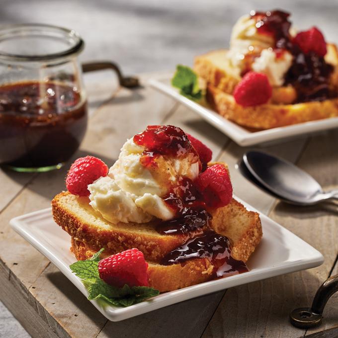 - Place cake slices in a bowl and top with ice cream and peach bourbon sauce. Garnish with raspberries.