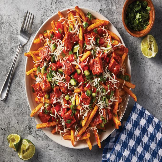 - To serve, place seasoned fries on a plate and top with butter masala tofu and sauce. Sprinkle mozzarella over the top and garnish with the tomato and cucumber mix.