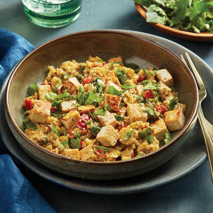 - Once tofu is seared, add cauli rice to the pan and continue to cook for 3 minutes, stirring every 30 seconds, until heated through.
