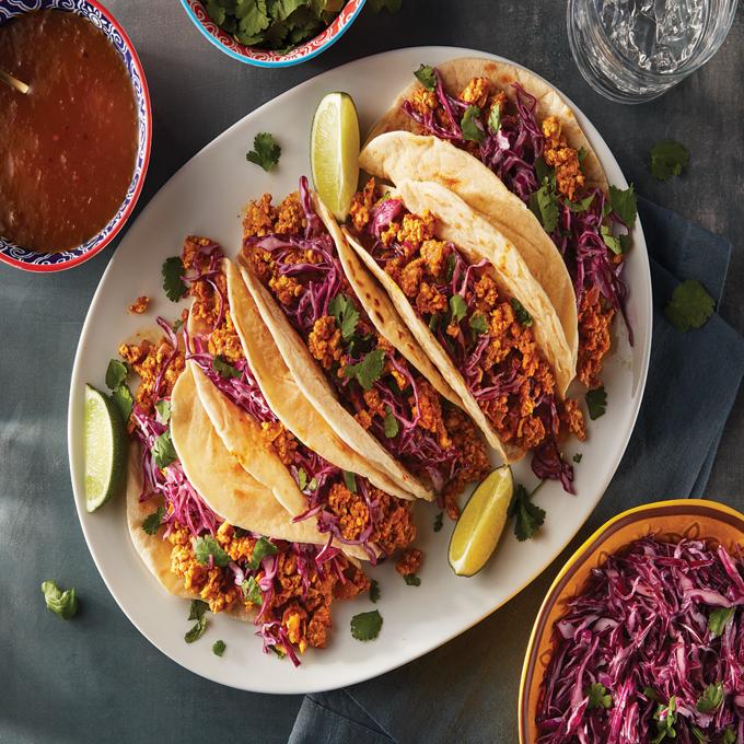 - Heat tortillas in a dry skillet. Evenly divide taco filling between tortillas, top with slaw, and serve.