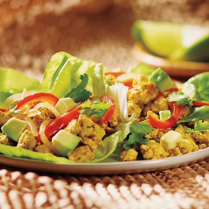 - To build taco wraps, fill lettuce leaves with 1/3 cup tofu filling and top with bell peppers and onions, tomatoes, avocado and cilantro.