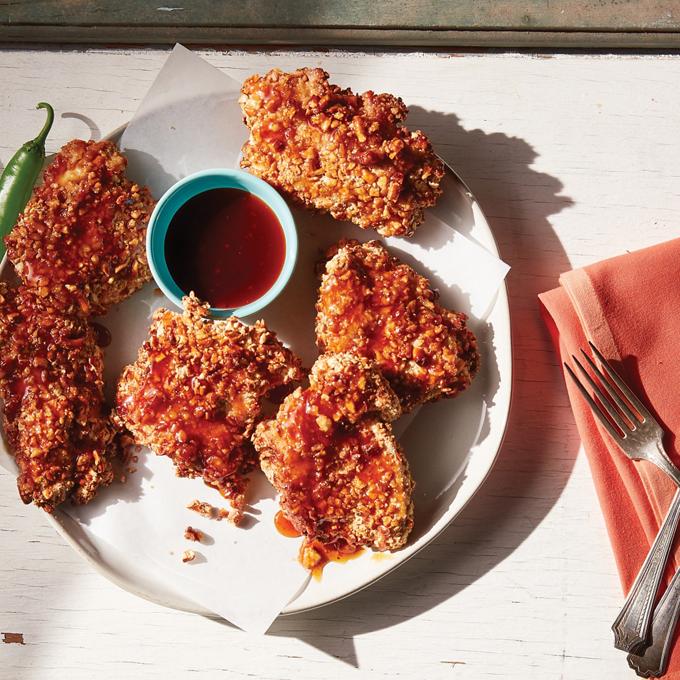 - One at a time, remove chicken pieces from marinade, coat in pretzel crumbs and place in air fryer basket. When all the chicken has been coated, cook on chicken setting (400ºF) for 15 minutes.