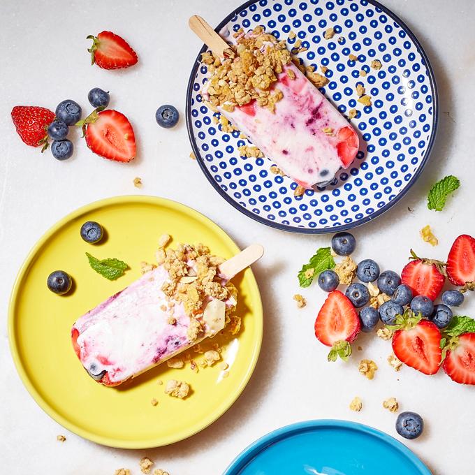 - Layer berries and yogurt into popsicle molds all the way up to the top. Finish top layer with granola.