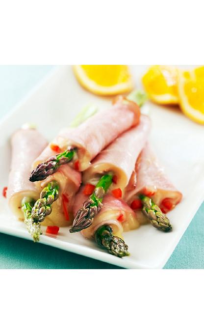 - Arrange the asparagus spear lengthwise in the center of the ham and cheese.