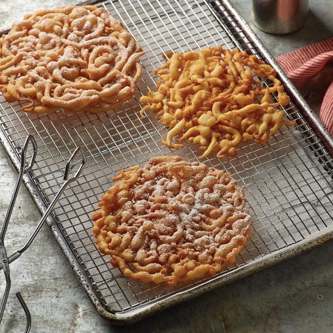 - Pour 1/4 - 1/2 cup batter through funnel into hot oil, moving in circular or spiral motion to make each cake. Fry each cake until golden brown, (about 1 - 2 minutes per side). Remove when cooked with tongs and lay on rack to dry and allow excess oil to drain.