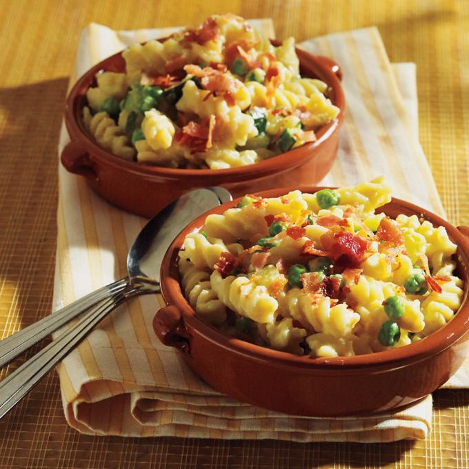 - Stir in cheeses then combine with pasta and mix well. Crumble bacon over the top and serve.