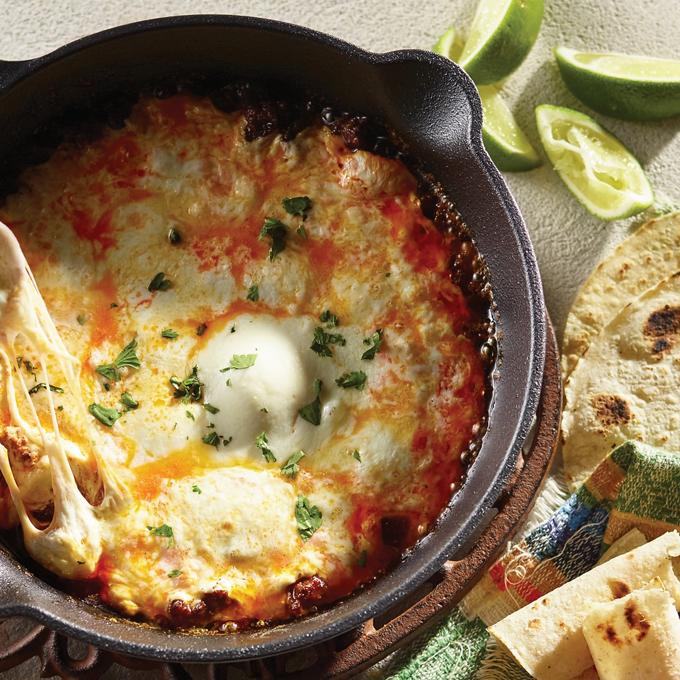 - Place cheese in center of chorizo, and bake 15 minutes or until bubbly.