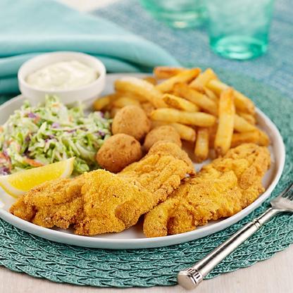 - Combine cornmeal, flour, salt, cayenne pepper and garlic powder.