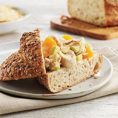 - Add almonds to tuna salad. Spread salad on both halves of the bread and cut each half into 8 servings.