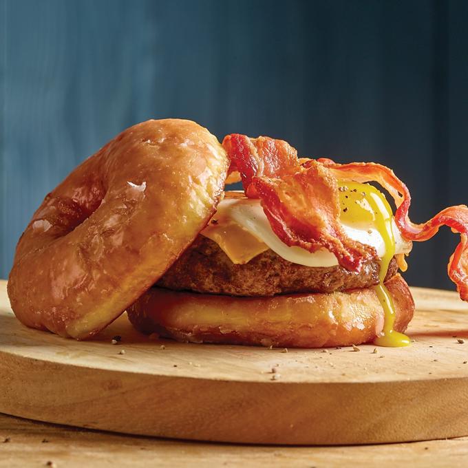 - Build burgers to taste using the donuts as the bun. Top with bacon and your favorite condiments.