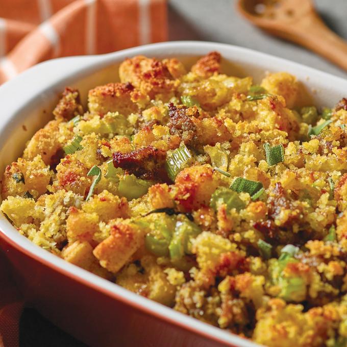 - Meanwhile, cube 3/4 of cornbread and add to bowl with veggies and sausage. Add salt, pepper, sage and croutons.
