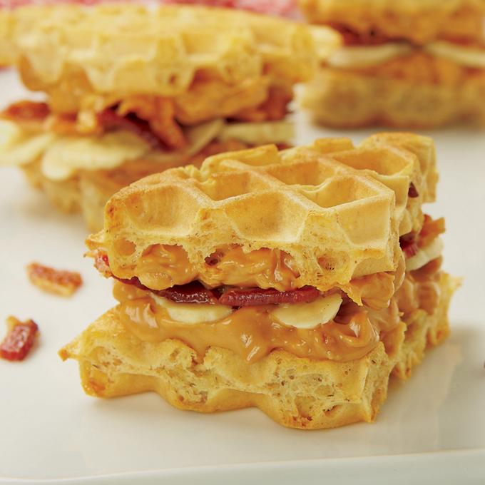- Layer sliced bananas and crumbled bacon over peanut butter on one waffle. Top with the second waffle peanut butter side down.