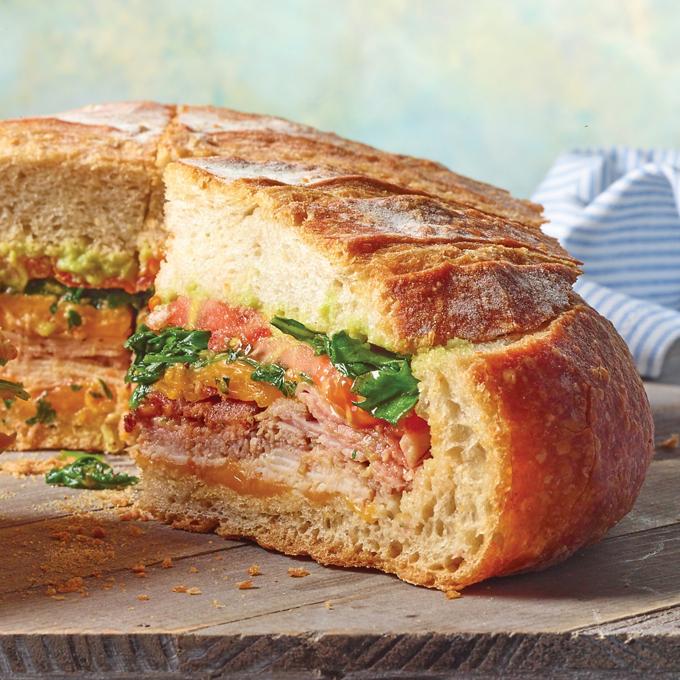 - Layer 5 slices of cheddar cheese, and all of the turkey, roast beef, ham, and chopped bacon inside the hollowed out loaf. Add remaining cheddar cheese, press down, then add sliced off top of bread.