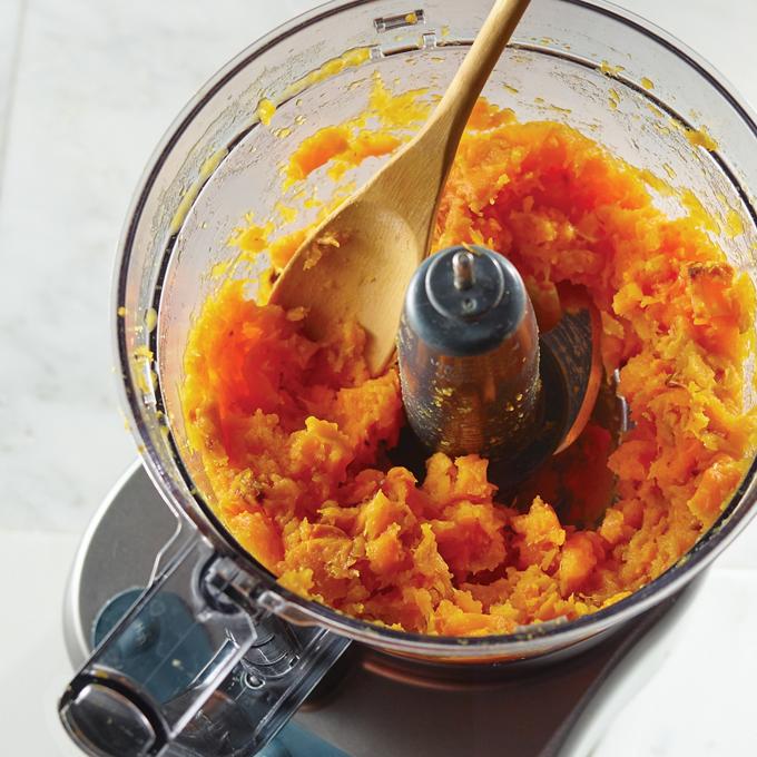 - Using a large spoon remove roasted pumpkin from skin. Place in a food processor and puree until smooth.