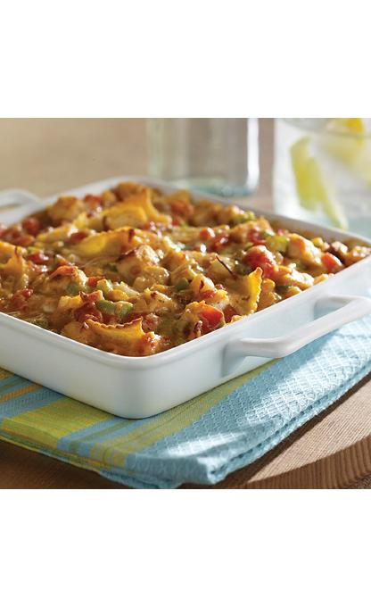 3. In 13 x 9 x 2-inch baking pan, layer tortilla pieces, soup mixture, and cheese. Repeat for three layers.