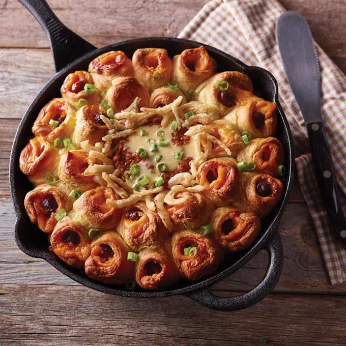 - Fill center of ring with chili, queso, crispy onions and a garnish of green onions, if desired.