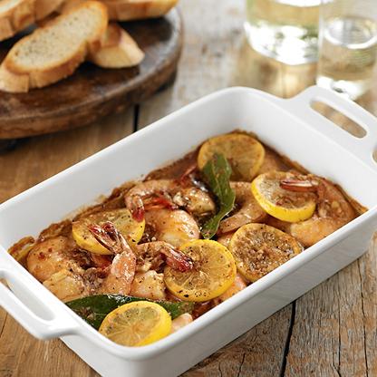 - Remove from oven and serve shrimp on large platter with lemon slices and French bread if desired.