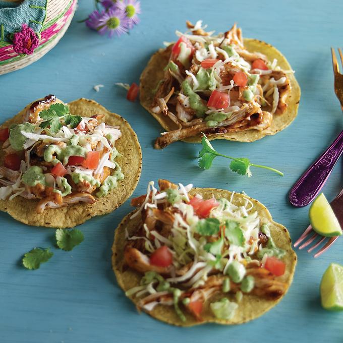 Pulled BBQ Chicken Tostadas with Roasted Poblano Crema