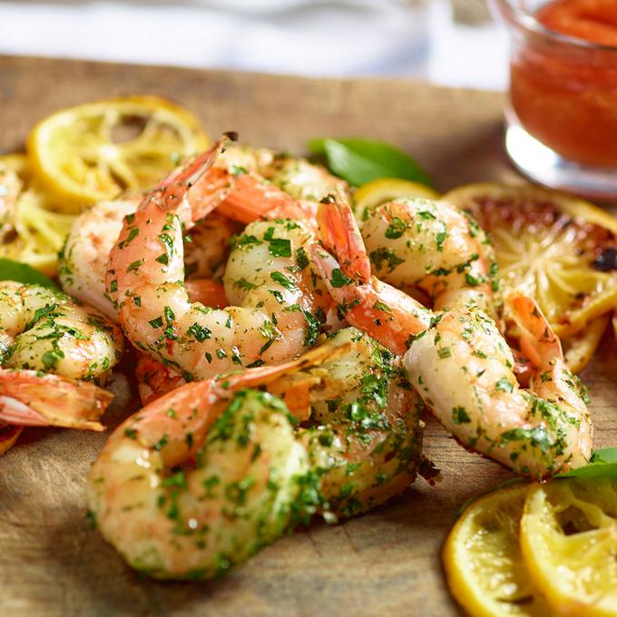 - In a large bowl, place shrimp, lemons, cumin, parsley and rub. Toss well to coat.