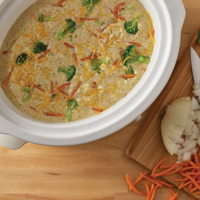 - Place broccoli, carrots, onions, garlic, chicken stock and cream cheese into slow cooker. Cook on high for 2 hours.