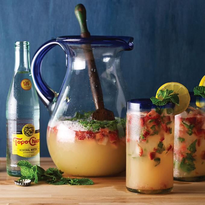 - In a large pitcher combine honey, mint, and strawberries. Mash with a muddler or large wooden spoon.