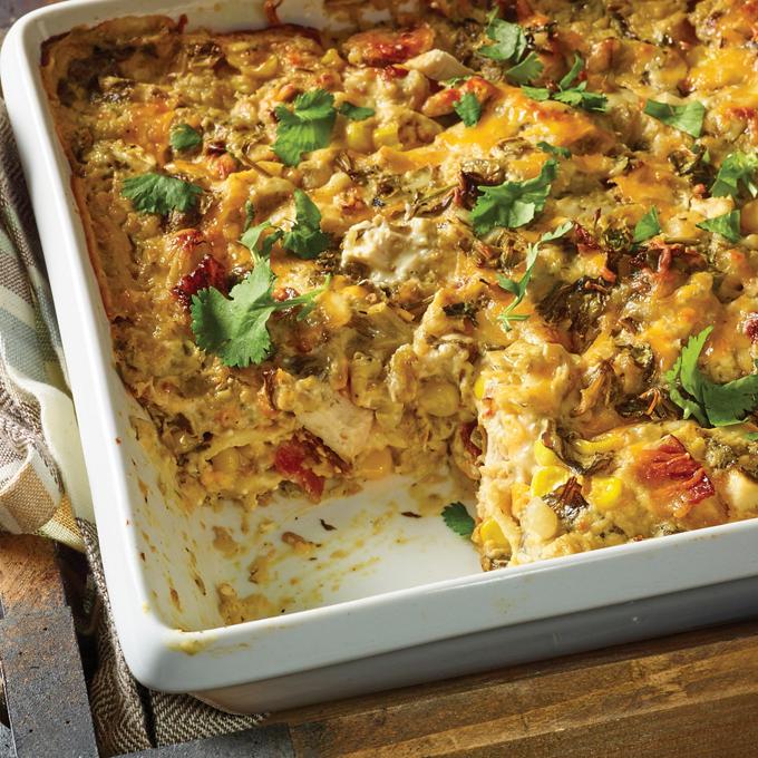 4. Layer tortilla slices, green chili sauce, cooked chicken, shredded cheese, bacon, corn, spinach and green onions in several layers, ending with shredded cheese.
